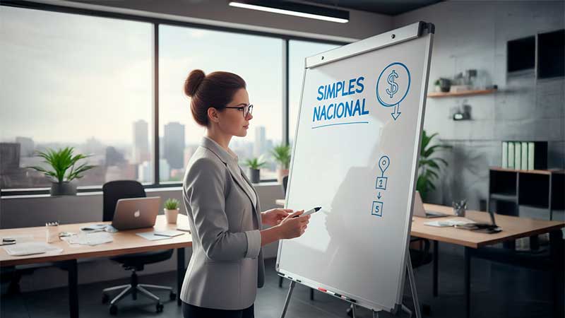 Profissional analisando um quadro branco com a descrição 'Simples Nacional', vantagens e desvantagens, representando a decisão sobre o regime tributário.